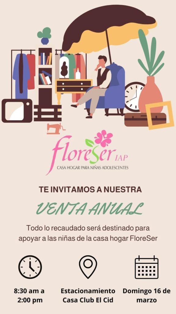 Con el objetivo de recaudar fondos para beneficiar a las niñas adolecentes de la casa hogar, FloreSer IAP invita a su venta anual que se llevara a cabo el día de hoy. La cita es a partir de las 8:30 de la mañana hasta las 2:00 de la tarde en el estacionamiento de la casa club El Cid. Todo lo recaudado será destinado a apoyar y mejorar la calidad de vida de las niñas que forman parte de esta noble institución. ¡No te lo pierdas!