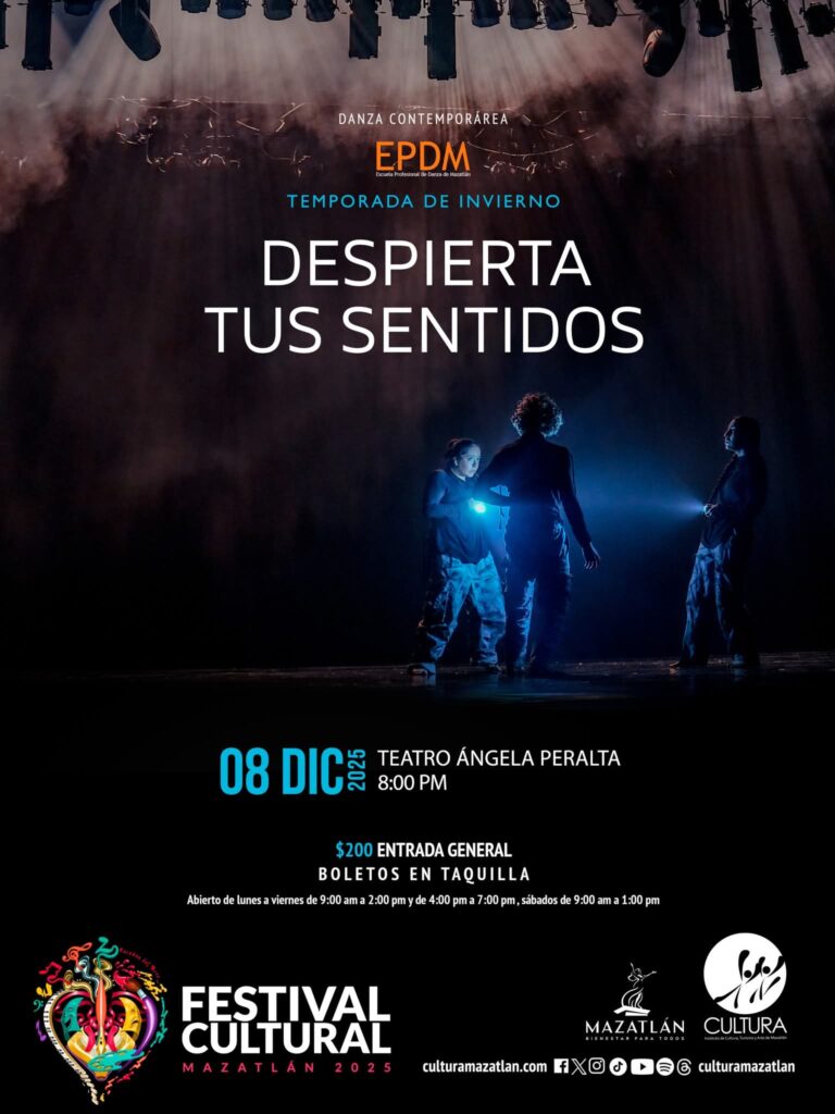 La Escuela Profesional de Danza de Mazatlán prepara una de sus noches más intensas y estimulantes del año. El lunes 8 de diciembre a las 8pm el Festival Cultural Mazatlán 2025 y la EPDM presentarán su emblemática “Temporada de Invierno, despierta tus sentidos”, un programa que año con año se convierte en punto de encuentro para quienes ven en la danza contemporánea un espacio de libertad, identidad y fuerza creativa. El Escenario perfecto no podría ser otro más que el Teatro Ángela Peralta, un espacio donde generaciones de bailarines han descubierto su vocación. Y este 2025, la EPDM llega renovada, impulsada por la codirección artística y académica de Xitláli Piña y Johnny Millán, quienes desde 2024 han llevado a la escuela hacia una etapa marcada por la innovación, la excelencia formativa y una proyección internacional cada vez más fuerte. Los boletos tienen un costo de $250 pesos general y ya están a la venta en taquilla del Teatro Ángela Peralta y por WhatsApp en la Taquilla Digital de Cultura al 669 120 0020.